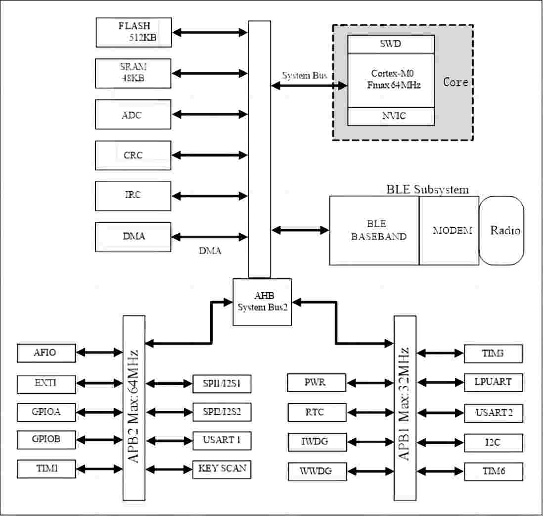 藍(lán)牙芯片是InnoStar新一代高性能、超低功耗的藍(lán)牙5.1芯片,采用32位ARM Cortex-M0內(nèi)核,最高工作主頻64MHz,片上集成48KB SRAM,512KB Flash。