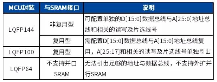 MM32F3270系列MCU因?yàn)榉庋b的原因,導(dǎo)致只有部分MCU產(chǎn)品可以通過(guò)硬件復(fù)用出全部或部分的FSMC接口的相關(guān)GPIO,才能支持外接SRAM存儲(chǔ)器擴(kuò)展存儲(chǔ)空間。其中LQFP144引腳封裝MCU芯片支持連接地址數(shù)據(jù)非復(fù)用和復(fù)用方式外擴(kuò)并行SRAM;而LQFP100引腳封裝芯片因地址線(xiàn)縮減,僅支持連接地址數(shù)據(jù)復(fù)用方式外擴(kuò)并行SRAM。LQFP64因?yàn)闊o(wú)法引出足夠的地址與數(shù)據(jù)總線(xiàn),不支持外擴(kuò)并行SRAM。
