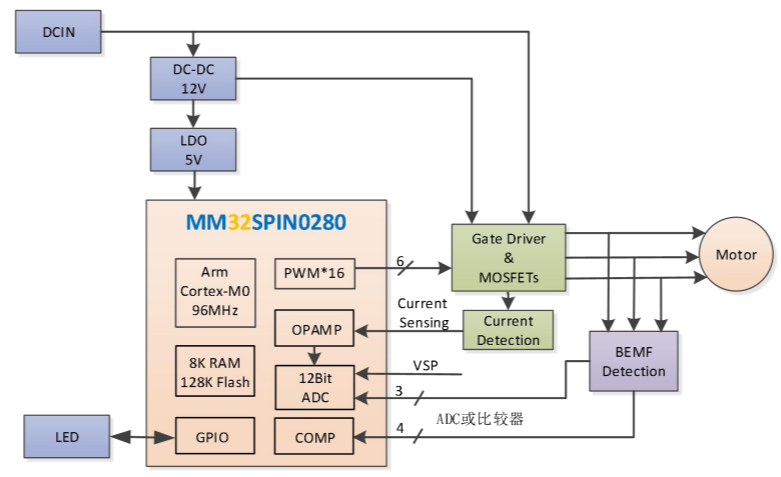 硬件系統(tǒng)由外部DC電源供電,經(jīng)降壓后得到12V給Gate driver IC供電以驅(qū)動(dòng)功率開關(guān)管,12V通過降壓IC輸出5V給MM32SPIN系列微處理器及其他功能模塊供電。通過外部電路檢測(cè)反電動(dòng)勢(shì)過零點(diǎn)信號(hào),對(duì)應(yīng)六種不同的逆變器