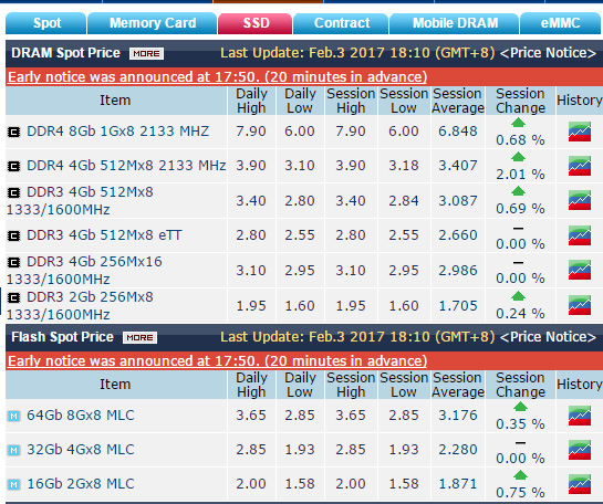 內(nèi)存漲價(jià)已經(jīng)是2016年下半年來的主流趨勢(shì),2017年開年也是如此,而且本季度漲的可能更兇了,從Dramxchange的統(tǒng)計(jì)數(shù)據(jù)來看,1月份以來4Gb DDR4顆粒價(jià)格飆升0.51美元,漲幅18%,截至2月3日4Gb DDR4顆粒的高位價(jià)格達(dá)到了3.9美元,平均也有3.4美元,這是2015年7月30日以來的新紀(jì)錄,創(chuàng)下18個(gè)月來新高。
