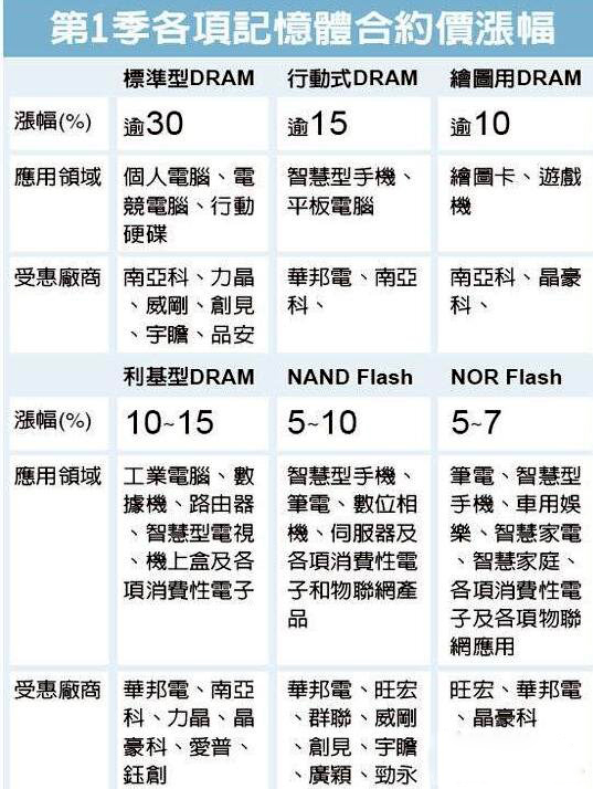 今年存儲芯片缺貨效應持續擴大,繼DRAM、儲存型快閃存儲(NAND Flash)在淡季飆出歷年最大漲幅后,編碼型快閃存儲(NOR Flash)也在睽違四年多來初次提價,第一季度調漲5~7%不等,下季漲幅更大,估計漲幅逾10%。