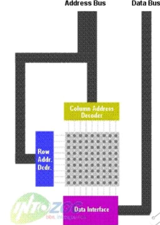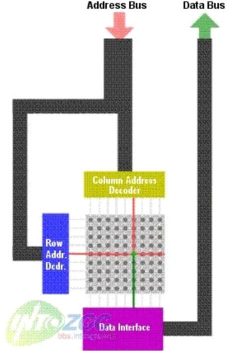 需要注意的是RAM內的部存儲信息的矩陣并不是一個正方形的,也就是行和列的數目不是相同的--行的數目比列的數目少(DRAM)。