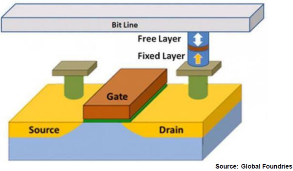 磁性隨機存取存儲器(場或自旋器件)使用一個選擇晶體管作為存儲單元,見下圖1。MRAM單元可以具有專用晶體管,或者該晶體管可以在兩個存儲單元之間共享。在用于MRAM生產之前,必須在晶片上創建特定的選擇晶體管設計。
