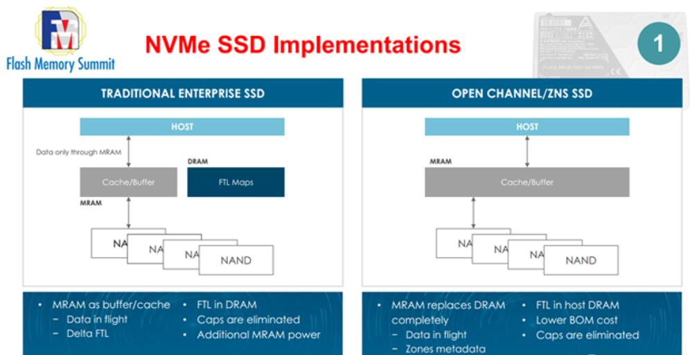 采用MRAM之后,NVMe SSD內(nèi)部的架構(gòu)發(fā)生了以下圖片的變化,將MRAM作為數(shù)據(jù)緩存使用,而FTL映射表存儲依然是DRAM: