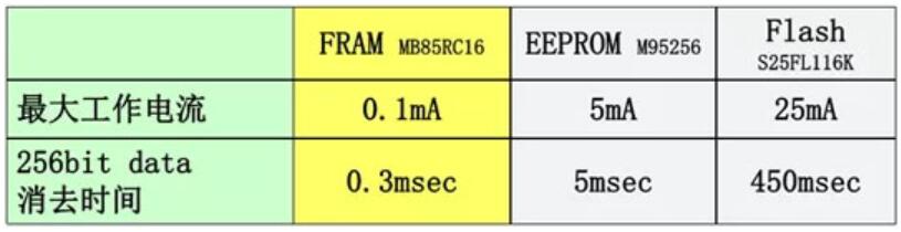FRAM、EEPROM、FLASH工作電流與消去時間對比