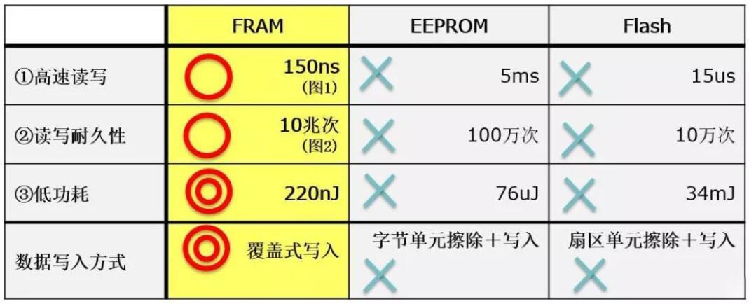富士通FRAM主要具備三大優(yōu)勢(shì):高讀寫入耐久性、高速寫入以及低功耗,這是絕大多數(shù)同類型存儲(chǔ)器無法比擬的。比如FRAM寫入次數(shù)壽命高達(dá)10萬億次,而EEPROM僅有百萬次(10^6)。