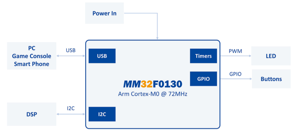 靈動(dòng)微MM32F0133C7P整合USB接口與豐富的資源,在設(shè)計(jì)外接聲卡時(shí)能與DSP做連接與溝通,此外USB界面通過USB-IF certificate,無論是在接到Host端的PC/NB,Game console與Smart Phone都可以有良好的兼容性。