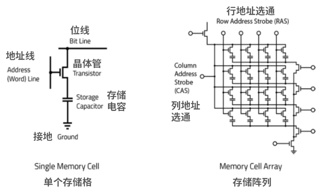 DRAM由許多重復(fù)的位元格組成,每一個基本單元由一個電容和一個晶體管構(gòu)成。電容中存儲電荷量的多寡,用于表示“0”和“1”。而晶體管,則用來控制電容的充放電。