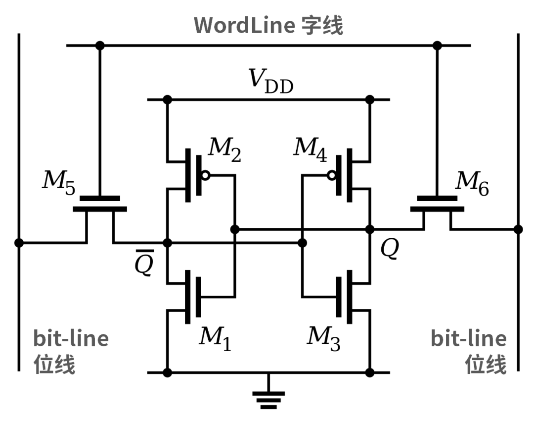 SRAM的基本單元,則最少由6管晶體管組成:4個場效應(yīng)管(M1,M2,M3,M4)構(gòu)成兩個交叉耦合的反相器,2個場效應(yīng)管(M5,M6)用于讀寫的位線(BitLine)的控制開關(guān),通過這些場效應(yīng)管構(gòu)成一個鎖存器(觸發(fā)器),并在通電時鎖住二進(jìn)制數(shù)0和1。因此,SRAM被稱為“靜態(tài)隨機(jī)存儲器”。
