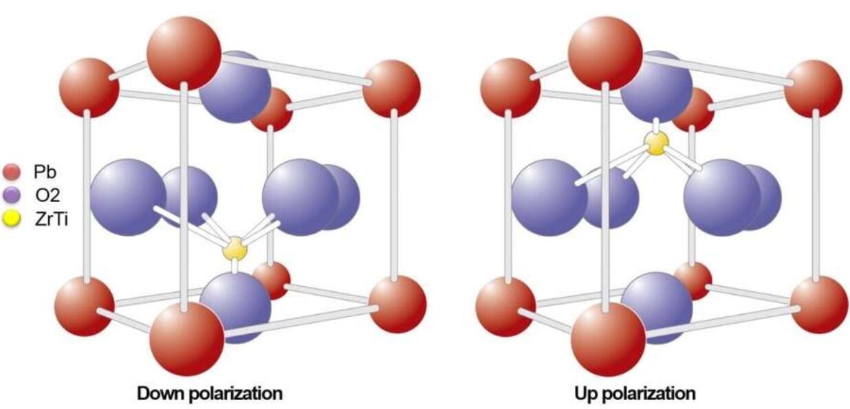 這些吸引人的特性是鋯鈦酸鉛(PZT)是其中一種材料的鐵電性能的結(jié)果。PZT具有鈣鈦礦晶體結(jié)構(gòu),中心有一個(gè)陽離子(見圖1)。該陽離子可以處于兩個(gè)位置之一,并且可以通過施加電場(chǎng)來切換位置。每個(gè)轉(zhuǎn)換都會(huì)產(chǎn)生“開關(guān)電荷”(Q s),可以將其讀取以表示邏輯1或0。