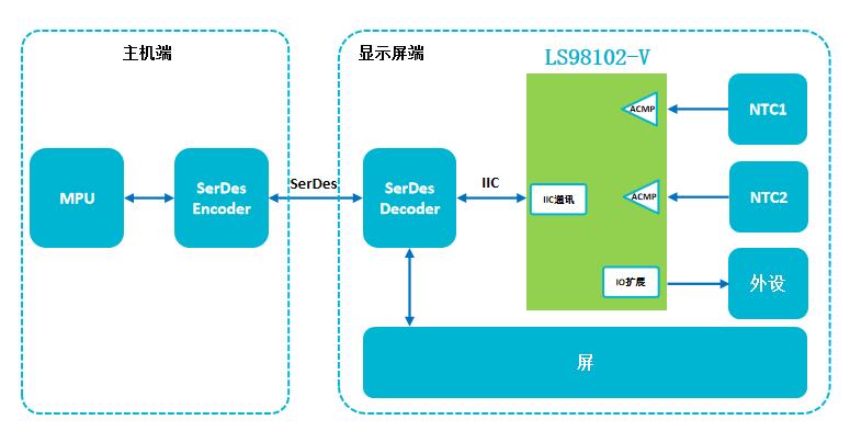 現(xiàn)場(chǎng)可重構(gòu)IC LS98102/-V采用QFN14封裝(車規(guī)級(jí)),供電范圍2.3V~5.5V,靜態(tài)電流100nA,12個(gè)可任意配置GPIO。該器件具有監(jiān)控2路NTC的溫度,溫度異常時(shí)發(fā)出中斷給SerDes端,主機(jī)控制發(fā)出關(guān)屏等指令信息擴(kuò)展GPIO口,用于控制顯示屏端其他外設(shè)。